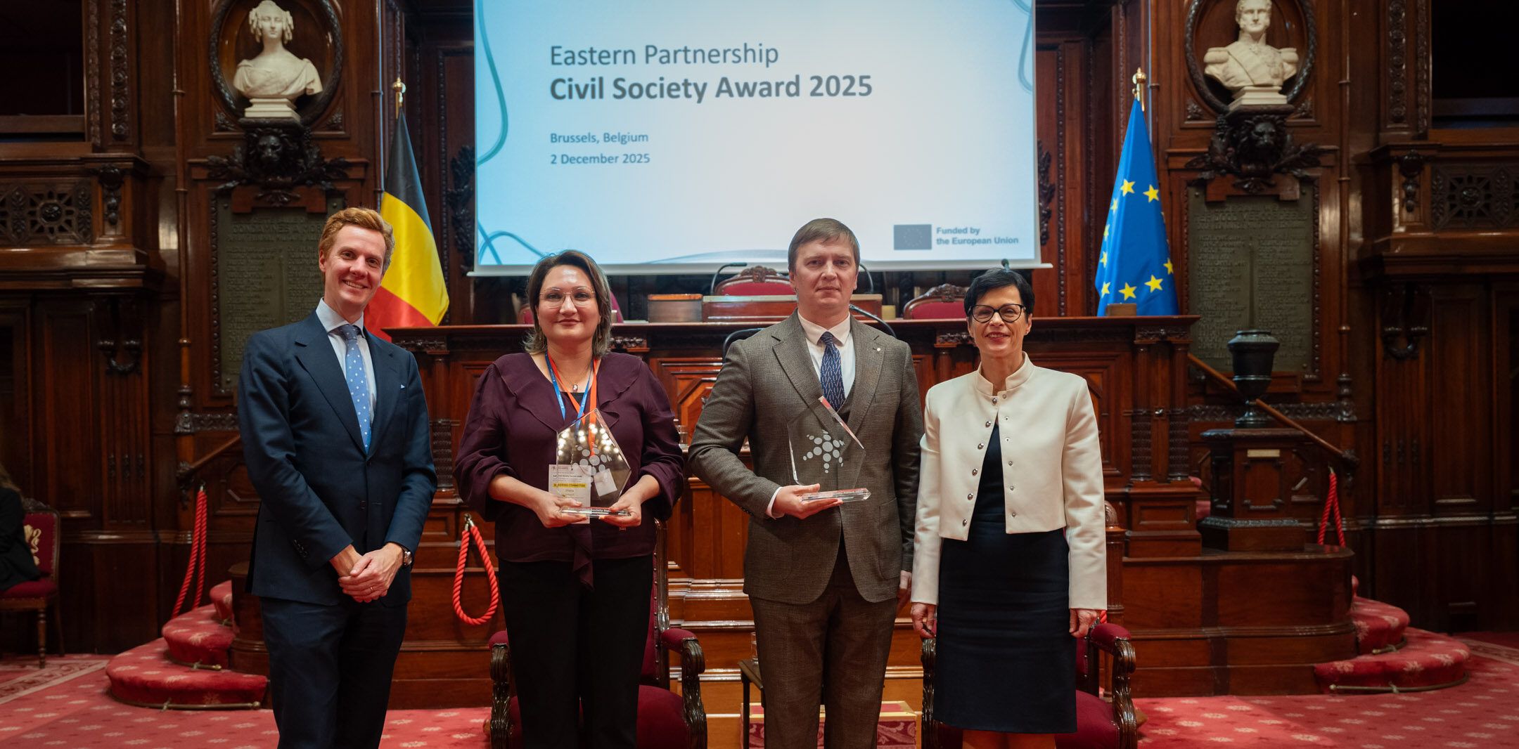 Commissioner Marta Kos and Belgium Ministry for Foreign Affairs representative Christophe De Nijs with 2025 EaP Civil Society Awardees Shahla Ismayil and Hennadiy Maksak